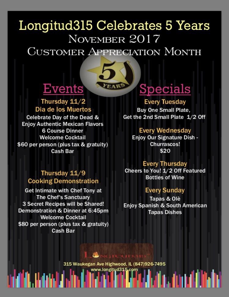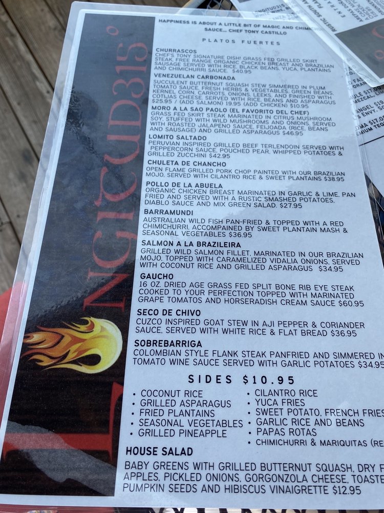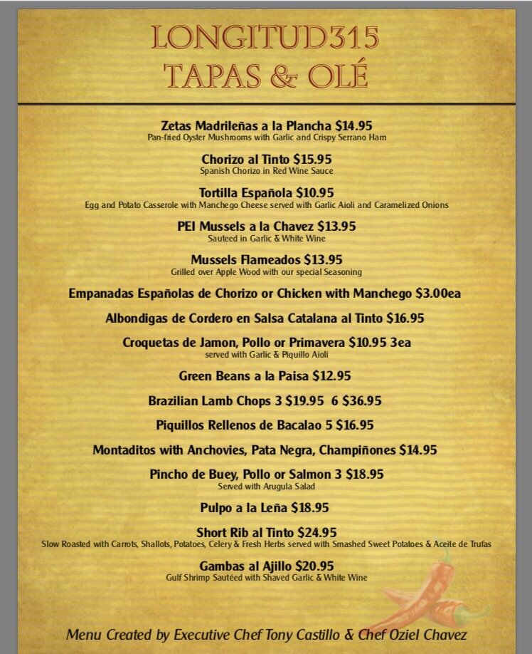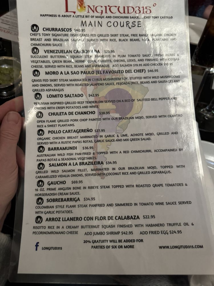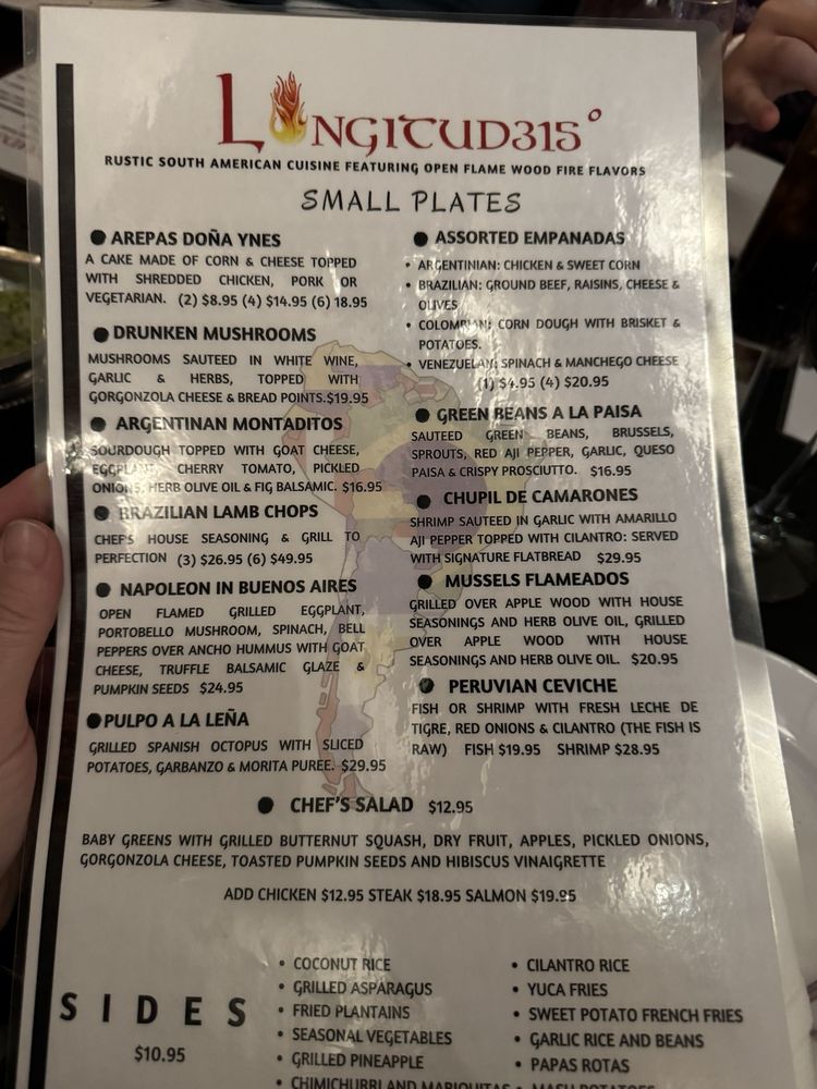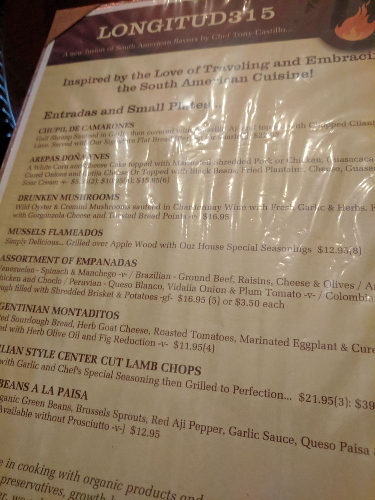 Longitud315, a Latin American restaurant located in Highwood, IL, offers a variety of dishes for patrons to enjoy. From the Corvina Ceviche to the Churrascos Chef Tony's Signature Dish, each plate is filled with vibrant flavors and fresh ingredients. The cozy ambiance, attentive staff, and inviting setting make it a top choice for diners looking for a memorable dining experience. While there are limited vegetarian options, the menu still offers flavorful choices like the vegetarian arepas and house salad. Complimentary plantain chips with green garlic sauce add a unique touch to the meal. Customers rave about dishes like the octopus and empanadas, showcasing the quality and taste of the food offered at Longitud315. If you're in the mood for Latin American cuisine with a cozy yet vibrant atmosphere, Longitud315 is a must-visit spot.