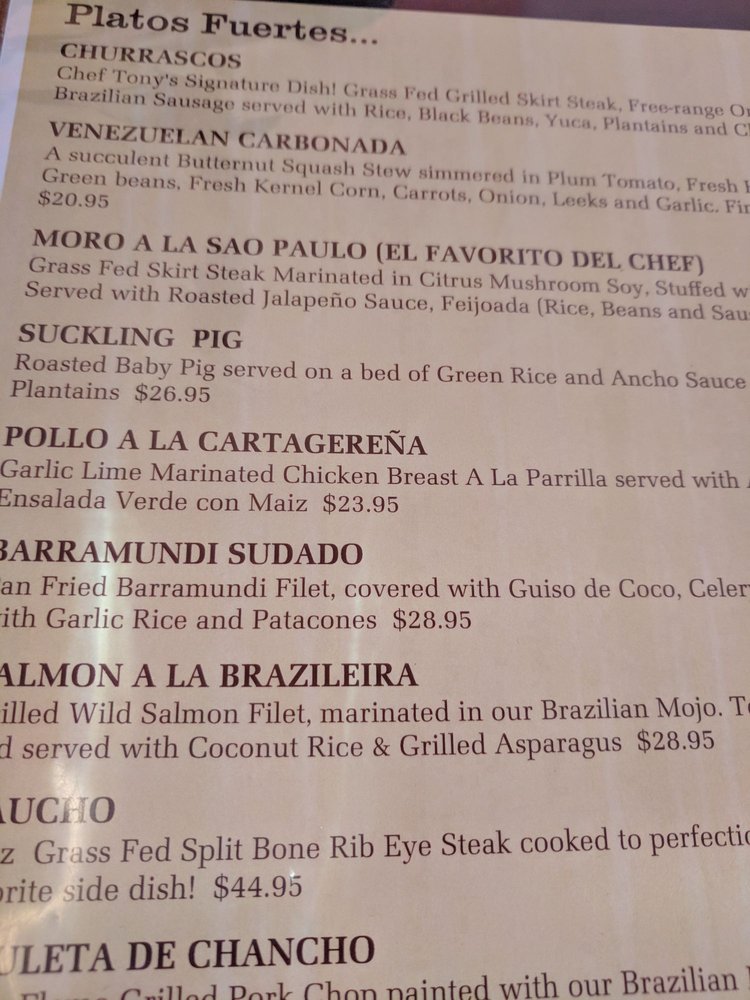 Chef Tony's Signature Dish! Grass Fed Skirt Steak, Free-range Organic Chicken Breast and Brazilian Sausage served with Rice, Black Beans, Yuca, Plantains and Chimichurri Sauce